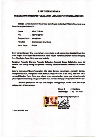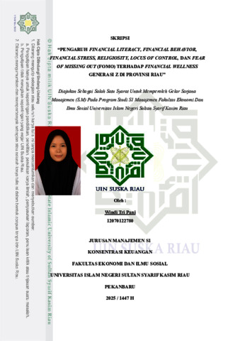 PENGARUH FINANCIAL LITERACY, FINANCIAL BEHAVIOR, FINANCIAL STRESS, RELIGIOSITY, LOCUS OF CONTROL, DAN FEAR OF MISSING OUT (FOMO) TERHADAP FINANCIAL WELLNESS GENERASI Z DI PROVINSI RIAU Oleh : Windi Tri Pani 12070122780 ABSTRAK Penelitian ini bertujuan untuk mengetahui pengaruh financial literacy, financial behavior, financial stress, religiosity, locus of control, dan fear of missing out (FOMO) terhadap financial wellness Generasi Z di Provinsi Riau. Generasi Z merupakan kelompok usia produktif yang tengah menghadapi transisi dari dunia pendidikan ke dunia kerja, yang ditandai dengan pola konsumtif, pengaruh media sosial, serta tantangan dalam pengelolaan keuangannya. Penelitian ini menggunakan pendekatan kuantitatif dengan metode survei melalui kuesioner yang disebarkan secara online untuk menjangkau generasi Z di 10 kabupaten dan 2 kota di Provinsi Riau. Sampel yang digunakan dalam penelitian ini sebanyak 402 responden yang dipilih melalui purposive sampling. Responden yang berpartisipasi adalah mereka yang termasuk generasi Z tahun kelahiran 1997-2007, dan berasal dari kabupaten/kota di provinsi Riau, serta analisis data menggunakan perangkat lunak SPSS dan SmartPLS versi 4. Hasil penelitian menunjukkan bahwa financial literasi, behavior, stress, religiosity, dan locus of control berpengaruh positif terhadap financial wellness, sedangkan fear of missing out (FOMO) memberikan dampak negatif terhadap financial wellness generasi Z di Provinsi Riau. Temuan ini menegaskan bahwa pentingnya peningkatan pengetahuan keuangan, pembentukan perilaku keuangan yang sehat, penguatan nilai religius, dan pengembangan kontrol diri dalam upaya meningkatkan financial wellness generasi Z. Kata kunci: Financial Literacy, Financial Behavior, Financial Stress, Religiosity, Locus of Control, Fear of Missing Out, Financial Wellness