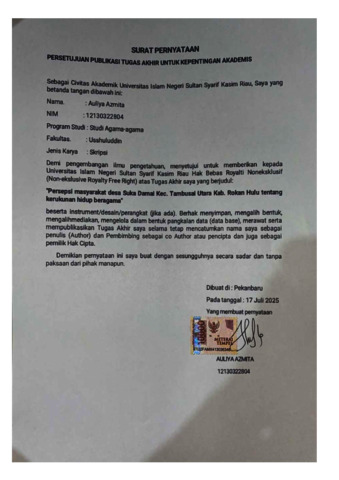 AULIYA AZMITA, - (2025) PERSEPSI MASYARAKAT DESA SUKA DAMAI KEC. TAMBUSAI UTARA KAB. ROKAN HULU TENTANG KERUKUNAN HIDUP BERAGAMA. Skripsi thesis, Universitas Islam Negeri Sultan Syarif Kasim Riau.