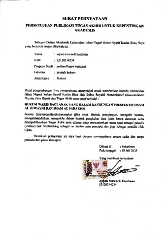 ABSTRAK Arpan Mawardi Hasibuan (2025) : Hukum Waris Bagi Anak Yang Dalam Kandungan Perspektif Imam Al- Juwayni Dan Imam Al-Sarakhsi Hukum waris dalam Islam berperan penting dalam mengatur pembagian harta peninggalan dan menjaga keadilan sosial. Salah satu masalah yang dibahas para ulama adalah hak waris anak yang masih dalam kandungan. Karena Al- Qur‘an dan hadis tidak menyebutkan secara eksplisit tentang hal ini, diperlukan ijtihad dari para ulama. Imam al-Juwayni dan Imam al-Sarakhsi merupakan dua tokoh yang membahas masalah ini secara khusus. Penelitian ini bertujuan untuk mengkaji pandangan Imam al-Juwayni dan Imam al-Sarakhsi tentang hukum waris bagi anak yang masih dalam kandungan, menganalisis metode istinbat hukum keduanya, serta membandingkan perbedaan pendapat yang muncul antara keduanya. Penelitian ini menggunakan metode studi pustaka dengan pendekatan komparatif. Data primer berasal dari kitab Nihāyah al-Maṭlab dan al-Mabsūṭ, serta didukung oleh sumber-sumber sekunder lainnya. Data dianalisis secara kualitatif dengan mengkaji isi dan metode istinbat hukum yang digunakan masing-masing ulama. Hasil penelitian menunjukkan bahwa keduanya sepakat janin berhak mewarisi jika sudah ada dalam kandungan saat pewaris wafat dan lahir hidup. Imam al-Juwayni membolehkan tanpa batas waktu kelahiran selama tidak lebih dari empat tahun. Sebaliknya, Imam al-Sarakhsi mensyaratkan janin lahir dalam waktu enam bulan setelah kematian pewaris. Dalam metode istinbat, al-Juwayni menggunakan pendekatan iḥtimāl dan kekerabatan, sementara al-Sarakhsi menggunakan qiyas dan perhitungan waktu (taqdīr al-zamān). Kata Kunci: Warisan, Janin, al-Juwayni, al-Sarakhsi, Fiqh Muqaran.