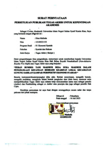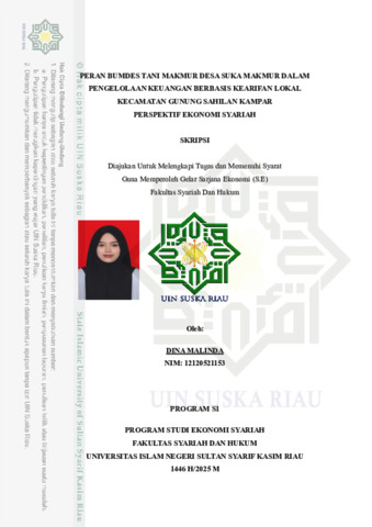 ABSTRAK Dina Malinda, (2025) : Peran Bumdes Tani Makmur Desa Suka Makmur dalam Pengelolaan Keuangan Berbasis Kearifan Lokal Kecamatan Gunung Sahilan Kampar Perspektif Ekonomi Syariah. Penelitian ini meneliti peran BUMDes Tani Makmur di Desa Suka Makmur dalam pengelolaan keuangan desa yang berlandaskan kearifan lokal, dilihat dari sudut pandang ekonomi syariah. Masalah penelitian yang diangkat adalah bagaimana BUMDes Tani Makmur mengelola dana desa dengan menggabungkan nilai-nilai kearifan lokal dan prinsip ekonomi syariah, serta apa saja hambatan yang dihadapi selama proses tersebut. Rumusan masalah penelitian ini mencakup: 1.Bagaimana Peran BUMDes Suka Makmur dalam mengelola keuangan berbasis kearifan lokal Kecamatan Gunung Sahilan Kampar? 2.Bagaimana pengembangan BUMDes Suka Makmur dalam mengelolaan keuangan berbasis kearifan lokal pada Kecamatan Gunung Sahilan kampar?3.Bagaimana pengelolaan keuangan berbasis kearifan lokal pada BUMDes Suka Makmur perspektif ekonomi syariah? Tujuan penelitian adalah untuk menganalisis kontribusi BUMDes Tani Makmur dalam pengelolaan keuangan masyarakat Desa Suka makmur, mengevaluasi penerapan prinsip ekonomi syariah dalam praktik pengelolaan keuangan, serta mengenali tantangan dan solusi yang muncul dalam proses tersebut. Metodologi penelitian yang diterapkan adalah penelitian kualitatif dengan pendekatan studi kasus. Data diperoleh melalui wawancara, pengamatan, dan dokumentasi yang melibatkan pengelola BUMDes, pemerintah desa, dan masyarakat setempat. Analisis data dilakukan secara deskriptif kualitatif dengan fokus pada pemahaman mendalam terhadap fenomena yang diteliti. Hasil penelitian menunjukkan bahwa BUMDes Tani Makmur memegang peranan penting dalam pengelolaan keuangan desa dengan menekankan pada prinsip transparansi, keadilan, dan manfaat sosial sesuai dengan norma ekonomi syariah, seperti pelarangan riba dan keadilan sosial. Tantangan utama yang ditemukan termasuk kurangnya sumber daya manusia dan partisipasi masyarakat, namun dapat diatasi melalui pelatihan bagi pengelola dan penguatan sistem administrasi keuangan. Pengelolaan keuangan yang profesional dan partisipatif meningkatkan kepercayaan masyarakat, serta memastikan seluruh unit usaha BUMDes beroperasi sesuai dengan prinsip halal dan fokus pada manfaat sosial-ekonomi. Kata kunci: BUMDes, kearifan lokal, ekonomi syariah, pengelolaan keuangan, pengembangan, Desa Suka Makmur.