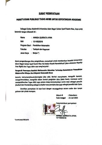 ANNISA QURRATA AYNA (2025) PENGARUH PENERAPAN REALISTIC MATHEMATICS EDUCATION TERHADAP KEMAMPUAN PEMODELAN MATEMATIKA DITINJAU DARI DISPOSISI MATEMATIS SISWA. Skripsi thesis, UNIVERSITAS ISLAM NEGERI SULTAN SYARIF KASIM.