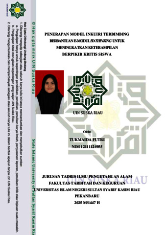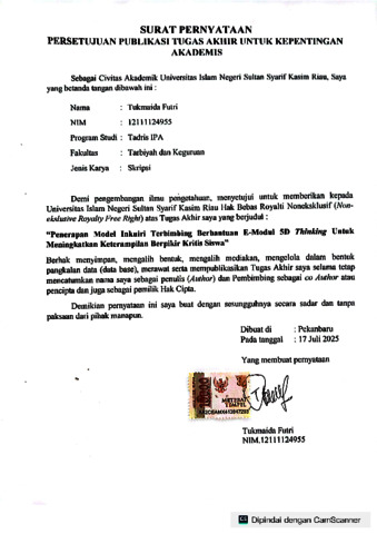 ABSTRAK Tukmaida Futri (2025) : Penerapan Model Inkuiri Terbimbing Berbantuan E-Modul 5D Thinking Untuk Meningkatkan Keterampilan Berpikir Kritis Siswa Kemampuan berpikir kritis peserta didik tingkat SMP masih tergolong rendah akibat dominasi pembelajaran konvensional dan minimnya inovasi media ajar. Model pembelajaran guided inquiry berbantuan e-modul berbasis 5D Thinking hadir sebagai solusi inovatif yang mengintegrasikan sains dengan nilai-nilai keislaman, serta dinilai efektif dalam meningkatkan keterampilan berpikir kritis. Penelitian ini bertujuan untuk meningkatkan keterampilan berpikir kritis peserta didik melalui penerapan model pembelajaran inkuiri terbimbing berbantuan E-Modul 5D Thinking pada materi struktur bumi dan perkembangannya. Metode yang digunakan adalah quasi experiment dengan desain non-equivalent control group. Populasi penelitian adalah peserta didik kelas VIII SMP Negeri 40 Pekanbaru, dengan teknik purposive sampling yang menghasilkan kelas VIII-A sebagai kelas eksperimen dan VIII-B sebagai kelas kontrol. Instrumen penelitian berupa soal esai dan lembar observasi. Hasil analisis post-test menggunakan uji Independent Sample t-test dengan bantuan SPSS versi 26 menunjukkan nilai signifikansi (Sig. 2-tailed) sebesar 0,030 (< 0,05), sedangkan nilai N-gain kelas eksperimen sebesar 0,7213 yang termasuk kategori tinggi. Temuan ini menunjukkan adanya peningkatan yang signifikan terhadap kemampuan berpikir kritis peserta didik setelah pembelajaran. Dengan demikian, model inkuiri terbimbing berbantuan E-Modul 5D Thinking terbukti efektif dalam meningkatkan keterampilan berpikir kritis peserta didik pada materi struktur bumi dan perkembangannya. Kata Kunci: Inkuiri Terbimbing, E-Modul 5D Thinking, Berpikir Kritis, Struktur Bumi dan Perkembangannya