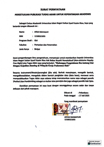 AFIFAH RAHMAYUNI, - (2025) HUBUNGAN PENGETAHUAN IBU TENTANG GIZI DENGAN KEJADIAN STUNTING DI WILAYAH KERJA PUSKESMAS SIAK. Skripsi thesis, UNIVERSITAS ISLAM NEGERI SULTAN SYARIF KASIM RIAU.