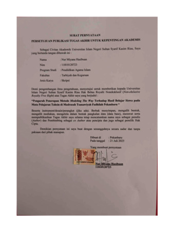 ABSTRAK Nur Miyana Hasibuan, (2025): Pengaruh Penerapan Metode Modeling the Way Pada Hasil Belajar Siswa pada Mata Pelajaran Tahsin di Madrasah Tsanawiyah Fadhilah Pekanbaru Penelitian ini dilatarbelakangi oleh masih banyaknya siswa yang belum mampu membaca Al-Qur‟an dengan baik dan benar dalam makhraj, mad dan tajwidnya. Tujuan penelitian ini untuk mengetahui pengaruh penerapan metode modeling the way terhadap hasil belajar siswa pada mata pelajaran tahsindi Madrasah Tsanawiyah Fadhilah Pekanbaru. Jenis penelitian ini yakni quasi eksperimen. Populasi dalam penelitian ini adalah seluruh siswa kelas VII di Madrasah Tsanawiyah Fadhilah Pekanbaru, teknik sampel menggunakan purposive sampling dengan sampel berjumlah 29 siswa kelas eksperimen dan 29 siswa kelas kontrol. Teknik pengumpulan data menggunakan observasi, tes lisan serta dokumentasi. Teknik analisis data menggunakan uji t. Berdasarkan hasil penelitian dapat disimpulkan Penerapan metode modeling the way berpengaruh terhadap hasil belajar pada mata pelajaran tahsin siswa di Madrasah Tsanawiyah Fadhilah Pekanbaru. Hal ini dapat dilihat dari hasil uji hipotesis pada uji t, diperoleh nilai Sig. 0.000 < 0.05 dan t hitung 6,448 >2,048 t tabel. berarti terdapat perbedaan hasil belajar tahsin siswa antara metode modeling the way dengan model konvensional. Persentase pengaruh dari penerapan metode ini terhadap hasil belajar tahssin siswa sebesar 60% berada kategori cukup efektif, selebihnya 40% dipengaruhi variabel lain yang tidak dibahas dalam penelitian ini. Kata Kunci: Metode Modelling The Way, Hasil Belajar Tahsin