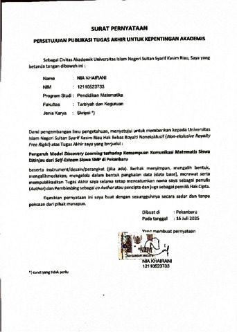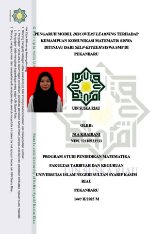 NIA KHAIRANI, - (2025) PENGARUH MODEL DISCOVERY LEARNING TERHADAP KEMAMPUAN KOMUNIKASI MATEMATIS SISWA DITINJAU DARI SELF-ESTEEM SISWA SMP DI PEKANBARU. Skripsi thesis, UIN SUSKA.
