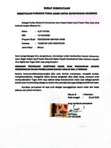 ALIF FATWA, - (2025) PENGARUH TECHNOLOGY ACCEPTANCE MODEL PADA PENGGUNAAN APLIKASI PENERJEMAHAN DALAM PEMBELAJARAN BAHASA ARAB DI SMA 2 TAMBANG. Skripsi thesis, UNIVERSITAS ISLAM NEGERI SULTAN SYARIF KASIM RIAU.