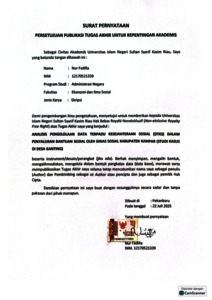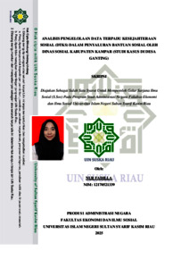ABSTRAK ANALISIS PENGELOLAAN DATA TERPADU KESEJAHTERAAN SOSIAL (DTKS) DALAM PENYALURAN BANTUAN SOSIAL OLEH DINAS SOSIAL KABUPATEN KAMPAR (STUDI KASUS DI DESA GANTING) Oleh: NUR FADILLA Penelitian ini bertujuan untuk menganalisis pengelolaan Data Terpadu Kesejahteraan Sosial (DTKS) dalam penyaluran bantuan sosial oleh Dinas Sosial Kabupaten Kampar, dengan studi kasus di Desa Ganting. Fokus utama penelitian adalah untuk mengetahui proses pengelolaan data DTKS serta mengidentifikasi faktor pendukung dan penghambat dalam proses verifikasi dan validasi data guna memastikan ketepatan sasaran penyaluran bantuan sosial seperti Program Keluarga Harapan (PKH), Bantuan Pangan Non Tunai (BPNT), dan Penerima Bantuan Iuran Jaminan Kesehatan Nasional (PBI-JKN). Penelitian ini menggunakan pendekatan kualitatif dengan metode deskriptif, dan data dikumpulkan melalui wawancara, observasi, dan dokumentasi. Hasil penelitian menunjukkan bahwa pengelolaan DTKS oleh Dinas Sosial Kabupaten Kampar telah mengikuti prosedur berdasarkan Permensos Nomor 3 Tahun 2021, namun pelaksanaannya masih menghadapi berbagai kendala. Faktor pendukung meliputi partisipasi aktif perangkat desa, pendamping sosial, serta adanya musyawarah desa. Sementara itu, faktor penghambat mencakup kurangnya pemahaman petugas terhadap aplikasi DTKS, ketidaksinkronan data antar instansi, dan rendahnya kesadaran masyarakat dalam melaporkan perubahan data. Untuk memastikan bantuan sosial tepat sasaran, diperlukan pembaruan data secara berkala, peningkatan koordinasi lintas sektor, serta pelatihan bagi petugas verval. Kata Kunci: Pengelolaan DTKS, Bantuan Sosial, Verifikasi dan Validasi, Dinas Sosial, Desa Ganting