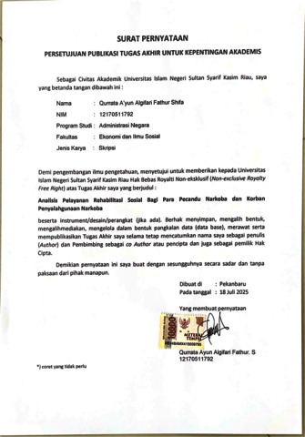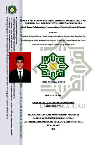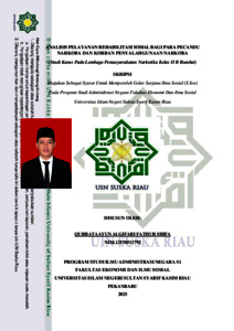 QURRATA A'YUN ALGIFARI FATHUR SHIFA, - (2025) ANALISIS PELAYANAN REHABILITASI SOSIAL BAGI PARA PECANDU NARKOBA DAN KORBAN PENYALAHGUNAAN NARKOBA (Studi Kasus Pada Lembaga Pemasyarakatan Narkotika Kelas II B Rumbai). Skripsi thesis, UNIVERSITAS ISLAM NEGERI SULTAN SYARIF KASIM RIAU.