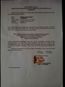 INDAH NURJANNAH, - (2025) PENGARUH LINGKUNGAN KERJA TERHADAP SEMANGAT KERJA PEGAWAI PADA BADAN PERENCANAAN PEMBANGUNAN DAERAH (BAPPEDA) KABUPATEN KAMPAR. Skripsi thesis, UNIVERSITAS ISLAM NEGERI SULTAN SYARIF KASIM RIAU.