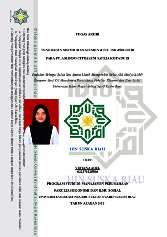 YOHANA ADEL, - (2025) PENERAPAN SISTEM MANAJEMEN MUTU ISO 45001:2018 PADA PT. ASRINDO CITRASENI SATRIA KOTA DURI. Laporan thesis, UNIVERSITAS ISLAM NEGERI SULTAN SYARIF KASIM RIAU.