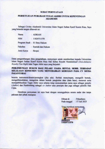 ADRIAN, - (2025) PERLINDUNGAN HUKUM BAGI PELAKU USAHA RENTAL MOBIL TERHADAP KELALAIAN KONSUMEN YANG MENYEBABKAN KERUGIAN PADA CV MITRA PAGANTI RIAU. Skripsi thesis, UIN SUSKA.