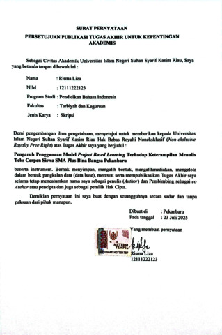 RISMA LIZA, - (2025) PENGARUH PENGGUNAAN MODEL PROJECT BASED LEARNING TERHADAP KETERAMPILAN MENULIS TEKS CERPEN SISWA SMA PLUS BINA BANGSA Pekanbaru. Skripsi thesis, UNIVERSITAS ISLAM NEGERI SULTAN SYARIF KASIM.