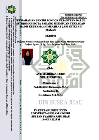 AYU MAHROZA LUBIS, - (2025) PEMAHAMAN SANTRI PONDOK PESANTREN DARUL ISTIQOMAH KOTA PADANG SIDIMPUAN TERHADAP HADIS KEUTAMAAN MENJILAT JARI SETELAH MAKAN. Skripsi thesis, Universitas Islam Negeri Sultan Syarif Kasim Riau.