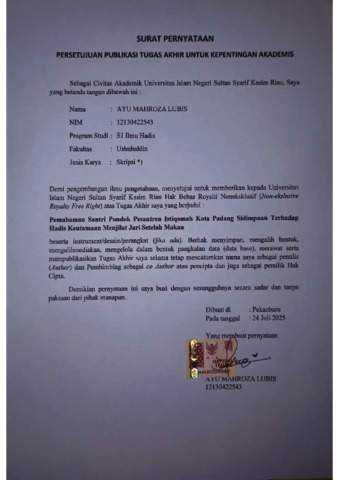 surat pernyataan publikasi - AYU MAHROZA LUBIS Ilmu Hadis S1.pdf - Published Version Download (155kB) | Preview |