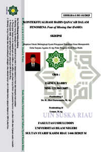ABSTRAK Skripsi ini berjudul "Kontekstualisasi Hadis Qana‟ah Dalam Fenomena Fear of Missing Out (FoMO)", Fenomena Fear of Missing Out (FoMO) merupakan gejala kecemasan sosial yang timbul akibat rasa takut tertinggal dari informasi, tren, atau aktivitas sosial, terutama yang tersebar melalui media digital. FoMO berdampak pada kesehatan mental, mendorong perilaku konsumtif, serta menurunkan kepuasan dan ketenangan batin individu. Dalam konteks ini, nilai qana‟ah sikap merasa cukup dan ridha terhadap rezeki yang diberikan Allah dapat dijadikan solusi spiritual dalam Islam. Penelitian ini bertujuan untuk mengetahui status dan pemahaman hadis qana‟ah, dan untuk mengkaji kontekstualisasi nilai qana‟ah dalam hadis terhadap fenomena FoMO. Penelitian ini menggunakan metode studi kepustakaan (library research) dengan pendekatan kualitatif-deskriptif. Teknik analisis meliputi takhrij hadis, analisis sanad dan matan, serta pendekatan kontekstual terhadap fenomena sosial kontemporer. Hasil penelitian menunjukkan bahwa hadis riwayat Imam Ahmad nomor 6572 tentang qana‟ah berstatus shahih, serta mengandung ajaran mendalam mengenai ketenangan batin, kesederhanaan, dan kebebasan dari ketergantungan duniawi; dan nilai qana‟ah tersebut sangat relevan dalam merespons dampak negatif FoMO, karena mampu meredam kecemasan sosial, mengurangi budaya perbandingan digital, dan menumbuhkan rasa syukur serta ketahanan jiwa dalam kehidupan modern. Dengan demikian, hadis qana‟ah terbukti tidak hanya normatif, tetapi juga aplikatif dalam menjawab tantangan psikologis masyarakat era digital. Kata Kunci: Hadis, Qana‟ah, FoMO, Kontekstualisasi.