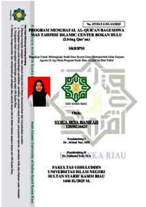 Skripsi ini berjudul “Program Menghafal Al-Qur’an Bagi Siswa MAS Tahfidz Islamic Center Rokan Hulu.” Program menghafal Al-Qur’an merupakan bagian penting dalam pendidikan keislaman, khususnya di lembaga pendidikan yang berbasis tahfidz. MAS Tahfidz Islamic Center Rokan Hulu sebagai salah satu lembaga pendidikan yang berfokus pada pembinaan hafalan Al-Qur’an menyelenggarakan program khusus dengan target capaian hafalan 30 juz bagi seluruh siswa. Saat ini, program tersebut diikuti oleh 190 siswa dengan berbagai tingkatan kemampuan hafalan. Meskipun program telah berjalan secara terstruktur, masih ditemukan beberapa kendala dalam pelaksanaannya, seperti keterbatasan waktu, tingkat konsistensi siswa, dan variasi metode hafalan yang digunakan. Penelitian ini bertujuan untuk mendeskripsikan pelaksanaan program menghafal Al-Qur’an di MAS Tahfidz Islamic Center Rokan Hulu, serta mengidentifikasi faktor-faktor pendukung dan penghambatnya. Pendekatan yang digunakan adalah pendekatan kualitatif deskriptif dengan metode lapangan dan kajian Living Qur’an. Teknik pengumpulan data dilakukan melalui observasi, wawancara mendalam, dan dokumentasi. Subjek penelitian terdiri dari guru tahfidz, siswa, serta kepala madrasah. Analisis data dilakukan melalui tahapan reduksi data, penyajian data, dan penarikan kesimpulan.Hasil penelitian menunjukkan bahwa pelaksanaan program menghafal Al-Qur’an di MAS Tahfidz Islamic Center Rokan Hulu telah terlaksana secara sistematis melalui kegiatan setoran hafalan harian, murojaah rutin, dan evaluasi berkala. Faktor pendukung pelaksanaan program meliputi adanya bimbingan intensif dari guru tahfidz, motivasi dari orang tua, dan lingkungan madrasah yang kondusif. Sementara itu, faktor penghambat yang dihadapi antara lain keterbatasan waktu akibat padatnya kegiatan akademik, kurangnya kedisiplinan sebagian siswa, serta belum maksimalnya strategi penguatan hafalan. Oleh karena itu, perlu adanya inovasi dalam strategi pembinaan tahfidz untuk mendukung pencapaian target 30 juz secara optimal. Kata Kunci: program tahfidz, living Qur’an, hafalan Al-Qur’an.