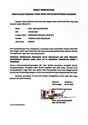 AIDIL AZZA MU'IZZUDDIN, - (2025) Pengaruh Penggunaan Permainan Kotak Pertanyaan (ASK BOX) terhadap Keterampilan Menulis Siswa Kelas VIII di Madrasah Tsanawiyah Negeri 1 Pekanbaru. Skripsi thesis, UNIVERSITAS ISLAM NEGERI SULTAN SYARIF KASIM RIAU.