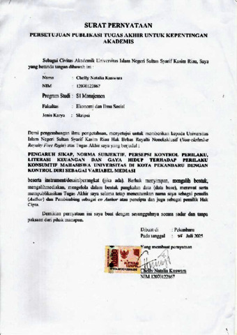 Chelly Natalia Kuswara, - (2025) Pengaruh Sikap, Norma Subjektif, Persepsi Kontrol Perilaku, Literasi Keuangan, dan Gaya Hidup terhadap Perilaku Konsumtif Mahasiswa Universitas di Kota Pekanbaru dengan Kontrol Diri sebagai Variabel Mediasi. Skripsi thesis, UNIVERSITAS ISLAM NEGERI SULTAN SYARIF KASIM RIAU.