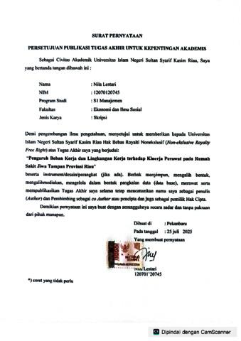 NILA LESTARI, - (2025) PENGARUH BEBAN KERJA DAN LINGKUNGAN KERJA TERHADAP KINERJA PERAWAT PADA RUMAH SAKIT JIWA TAMPAN PROVINSI RIAU. Skripsi thesis, UNIVERSITAS ISLAM NEGERI SULTAN SYARIF KASIM RIAU.