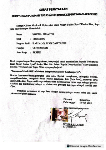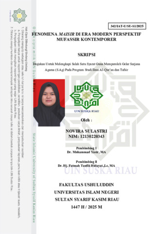 ABSTRAK Skripsi ini berjudul “Fenomena Maisir Di Era Modern Perspektif Tinjauan Mufassir Kontemporer”. Penelitian ini mengkaji tentang fenomena maisir (judi) yang merupakan praktik dilarang dalam Islam karena mengandung unsur spekulasi, ketidakpastian, untung-untungan serta dampak negatif yang meluas pada aspek moral, sosial, dan ekonomi. Di era modern, perkembangan teknologi digital telah memunculkan bentuk-bentuk baru maisir seperti judi online yang jauh lebih mudah diakses oleh berbagai kalangan masyarakat. Kondisi ini menimbulkan tantangan baru dalam memahami dan menafsirkan konsep maisir sebagaimana yang termaktub dalam Al-Qur’an. Penelitian ini bertujuan untuk mengkaji ulang makna dan bentuk maisir berdasarkan tinjauan tafsir kontemporer, serta menjelaskan bagaimana para mufassir modern menanggapi transformasi bentuk perjudian masa kini. Penelitian ini menggunakan metode kualitatif dengan pendekatan kepustakaan (library research), serta metode tafsir tematik (maudhū’i) terhadap ayat-ayat maisir dalam Al-Qur’an, khususnya QS. Al-Baqarah: 219 dan QS. Al-Māidah: 90–91. Data dikumpulkan melalui studi kitab tafsir kontemporer seperti Tafsir Al-Munīr karya Wahbah Az-Zuhaili, Tafsir Al-Misbah karya M. Quraish Shihab, dan juga dari Tafsir digital Al-Ma’rifah serta dilengkapi wawancara dengan Ustadz Musthafa Umar sebagai mufassir lokal. Hasil penelitian menunjukkan bahwa tafsir kontemporer memberikan pemaknaan yang kontekstual terhadap maisir, dengan menekankan bahaya transformasi judi dalam bentuk digital terutama kasus judi online yang sudah sanggat mengkhawatirkan khususnya di Negara Indonesia. dan aktivitas maupun transaksi sehari-hari tanpa disadari ada unsur maisir didalamnya yang semakin masif. Para mufassir kontemporer menegaskan bahwa esensi larangan maisir tetap berlaku terhadap segala bentuk perjudian modern, serta menyerukan perlunya edukasi dan regulasi yang sejalan dengan nilai-nilai Islam agar jangan sampai terjerumus kedalam praktik maisir. Kata Kunci: Maisir, Mufassir, Kontemporer, Era Modern.