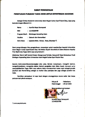 AURELLIA NOPA DAMAYANTI (2025) EFEKTIVITAS TEKNIK SELF CONTROL DALAM MENGURANGI PERILAKU KONSUMTIF PADA MAHASISWA PRODI BIMBINGAN KONSELING ISLAM UNIVERSITAS ISLAM NEGERI SULTAN SYARIF KASIM RIAU. Skripsi thesis, UNIVERSITAS ISLAM NEGERI SULTAN SYARIF KASIM.