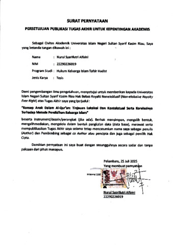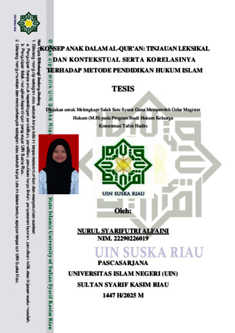 ABSTRAK Nurul Syarifutri Alfaini (2025): Konsep Anak Dalam Al-Qur’an: Tinjauan Leksikal dan Kontekstual Serta Korelasinya terhadap Metode Pendidikan Islam Penelitian ini mengkaji konsep anak dalam al-Qur‟an melalui pendekatan leksikal dan kontekstual serta mengaitkannya dengan metode pendidikan Islam. Dalam al- Qur‟an, istilah anak tidak disebut secara eksplisit dalam satu bentuk kata, melainkan dalam beragam istilah seperti walad, ibn, thifl, shabiy, dan ghulam. Penelitian ini bertujuan untuk mengungkapkan makna-makna dari istilah tersebut secara leksikal dan kontekstual, kemudian menganalisis korelasinya dengan nilai dan metode pendidikan Islam, seperti keteladanan, nasihat, dan pembiasaan. Metode yang digunakan adalah kualitatif-deskriptif dengan pendekatan tafsir tematik (maudhu‟i), menggunakan sumber primer al-Qur‟an dan tafsir klasik serta modern seperti Al-Kasysyaf, At-Tahrir wat Tanwir, dan Al-Munir. Hasil penelitian ini menunjukkan bahwa setiap istilah yang merujuk pada anak dalam al-Qur‟an mencerminkan tahapan usia dan tanggung jawab pendidikan yang berbeda. Walad merujuk pada anak usia dini (bayi) yang dijelaskan dalam surah al-Baqarah: 233, pada kata ibn, anak yang sudah mampu memahami sesuatu yang baik dan buruk, thifl pada anak pra-baligh, shabiy pada anak kecil usia dini, dan ghulam pada anak usia pra remaja. Pemaknaan ini memperkaya pemahaman tentang peran orang tua dalam mendidik anak secara bertahap, sesuai dengan perkembangan usia dan kejiwaan mereka. Penelitian ini merekomendasikan penerapan nilai-nilai al-Qur‟an dalam pendidikan anak untuk membentuk generasi yang berakhlak mulia, cerdas dan intelektual, serta siap menghadapi tantangan zaman. Kata Kunci: Anak, Leksikal, Kontekstual, Pendidikan.