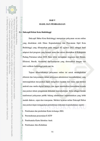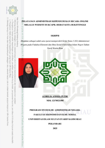 ABSTRAK PELAYANAN ADMINISTRASI KEPENDUDUKAN SECARA ONLINE MELALUI WEBSITE DUKCAPIL HEBAT KOTA BUKITTINGGI Oleh : Aurelia Annisa Putri NIM. 12170521498 Penelitian ini bertujuan untuk mengetahui pelaksanaan pelayanan administrasi kependudukan secara online melalui website Dukcapil Hebat serta faktor-faktor yang menghambat pelayanannya. Penelitian ini menggunakan pendekatan kualitatif deskriptif dengan teori Local Online Service Index (LOSI) yang mencakup aspek kelembagaan, partisipasi masyarakat, teknologi, penyediaan layanan, penyediaan konten, serta literasi e-government. Teknik pengumpulan data yang digunakan adalah wawancara, observasi, dan dokumentasi. Hasil penelitian menunjukkan bahwa layanan Dukcapil Hebat merupakan bentuk transformasi digital yang memberikan kemudahan kepada masyarakat dalam pengurusan dokumen kependudukan secara daring. Namun, dalam pelaksanaannya masih ditemukan berbagai kendala seperti kurangnya pemahaman masyarakat terhadap sistem online, keterbatasan sarana dan prasarana, minimnya sosialisasi, serta belum adanya regulasi setingkat daerah yang secara khusus mengatur pelaksanaan pelayanan daring. Oleh karena itu, dibutuhkan strategi yang lebih efektif untuk meningkatkan kualitas pelayanan serta dukungan dari berbagai pihak guna mewujudkan pelayanan administrasi kependudukan yang lebih optimal dan berkualitas. Kata Kunci: Pelayanan Publik, Administrasi Kependudukan, E-Government, Website Dukcapil Hebat Kota Bukittinggi