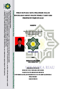 ABSTRAK Ikhsan Ilahi Zohir, 2024: Bawaslu Kota Pekanbaru Dalam Pencegahan Money Poilitics Pemilu 2024 Perspektif Fiqih Siyasah Money Politic adalah suatu pemberian atau janji menyuap seseorang baik supaya orang itu menjalankan haknya untuk memilih ataupun supaya ia menjalankan haknya dengan cara tertentu pada saat Pemilihan Umum. Dalam melaksanakan Pemilihan Umum disamping memperhatikan aturan hukum dalam Undang-Undang juga harus diperhatikan ketentuan dalam aturan hukum Islam. Penelitian ini bertujuan untuk mengetahui sejauh mana Peran Bawaslu dalam mencegah praktik Money Politic pada Pemilu tahun 2024, serta bertujuan untuk mengetahui bagaimana perspektif Fiqih Siyasah terhadap praktik Money Politic pada Pemilu tahun 2024. Penelitian ini menggunakan pendekatan Kualitatif dan dalam mengumpulkan data menggunakan metode penelitian lapangan (field research). Adapun teknik analisis data yang digunakan yaitu metode reduksin data, metode penyajian data, dan metode penarikan kesimpulan. Hasil dari penelitian ini menunjukan bahwa 1). Peran Bawaslu Kota Pekanbaru dalam mencegah praktik Money Politic berdasarkan UU Nomor 7 Tahun 2017 Tentang Pemilihan Umum pada Pemilu tahun 2024 masih kurang efektif dalam melaksanakan tugasnya, ini ditandai dengan kurangnya sosialisasi dibeberapa Kecamatan dikarenakan keterbatasan personil serta banyaknya laporan, aduan, temuan, terkait masalah praktik Money Politic namun tidak ada berhasil ditangani berdasarkan prosedur Hukum yang ada (tidak sampai ke pengadilan), hal ini dikarenakan lemahnya bukti yang tidak memenuhi syarat materil dan formil untuk diteruskan ke pengadilan dan minimnya kesadaran masyarakat akan dampak praktik money politic. 2). Faktor pendukung Bawaslu Kota Pekanbaru dalam mencegah terjadinya money politic didukung dengan kemajuan teknologi di era sekarang, Bawaslu meluncurkan aplikasi Gowaslu untuk mempermudah jajaran pengawas dalam menjaga keharmonisan pemilihan umum. Faktor Penghambat Bawaslu Kota Pekanbaru dalam mencegah terjadinya money politic yakni minimnya kolaborasi antara media, tokoh, masyarakat, tokoh adat, tokoh pemuda. Tim suskses memanfaatkan celah hukum sehingga praktik politik uang sulit ditegakkan hukum. 3). Tinjauan perspektf fiqih siyasah Bawaslu Kota Pekanbaru dalam mengawasi pelanggaran dalam pemilu terutama pelanggaran terkait money politic sudah dirasa cukup memenuhi kaidah fikih, Bawaslu melakukan beberapa agenda pengawasan seperti sosialisai di Kecamatan-kecamatan, sosialisasi kepada tokoh-tokoh masyarakat ataupun adat, hingga sampai melakukan sosialisasi ke kampus yang ada di Kota Pekanbaru. Hasil penelitian ini menjelaskan jika peran dan upaya Bawaslu Kota Pekanbaru sudah sesuai dengan kaidah fikih siyasah. Kata kunci: Bawaslu, Money Politic, Fiqih Siyasah