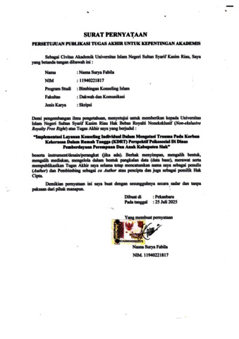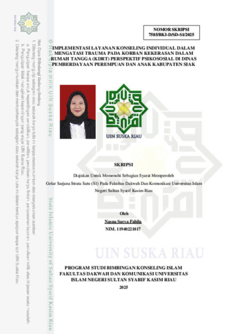 ABSTRAK Nama : Nasna Surya Fabila Jurusan : Bimbingan Konseling Islam Judul : Implementasi Layanan Konseling Individual Dalam Mengatasi Trauma Pada Korban Kekerasan Dalam Rumah Tangga (KDRT) Perspektif Psikososial Di Dinas Pemberdayaan Perempuan Dan Anak Kabupaten Siak Penelitian ini bertujuan untuk mengetahui implementasi layanan konseling individual dalam mengatasi trauma pada korban kekerasan dalam rumah tangga dari sudut pandang psikososial di dinas perempuan dan anak Kabupaten Siak dengan menggunakan teori bimbingan konseling individu dan psikososial. Penelitian ini termasuk kedalam penelitian kualitatif deskriptif. Hasil penelitian menujukkan bahwa untuk mengatasi trauma dan ketakutan yang berlebihan dapat dilakukan dengan teknik Konseling Individual Psikososial yang diimplementasikan dengan bentuk Solution Focused Teraphy, Cognitive Behavior Therapy (TBT), Prolonged Exposure (PE) Therapy, dan Traumatik Healing. Hasil dari penelitian ini adalah pendekatan psikososial yang dilakukan dinilai cocok dan digunakan oleh psikolog UPT Dinas Perempuan Dan Anak Kabupaten Siak karena bisa menghilangkan rasa trauma pada korban KDRT dan kembali kepada lingkungan sosialnya. Kata Kunci : Kekerasan Dalam Rumah Tangga, Korban Kekerasan