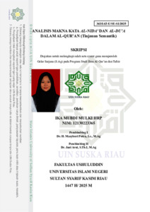 ABSTRAK Skripsi ini berjudul “ANALISIS MAKNA KATA AL-NIDA’ DAN AL-DU’A DALAM AL-QUR’AN (TINJAUAN SEMANTIK). Kajian ini dilatar belakangi oleh pentingnya memahami makna kosa kata Al-Qur’an secara tepat agar tidak terjadi kesalahpahaman dalam penafsiran. Kedua kata ini sama-sama bermakna “seruan” atau “panggilan”, namun memiliki konteks penggunaan yang berbeda. Penelitian ini bertujuan untuk mengkaji makna dua kata dalam Al-Qur’an yang sering dianggap sinonim, yaitu Al-Nida’ dan Al-Du’a, melalui pendekatan semantik. Adapun rumusan masalah dalam penelitian ini adalah; (1) Bagaimana makna kata al-nida’ dan al-du’a menurut mufassir? dan (2) Bagaimana persamaan dan perbedaan makna kata al-nida’ dan al-du’a berdasarkan semantik? Penelitian ini juga bertujuan untuk mengidentifikasi persamaan dan perbedaan makna dari dua kata tersebut, serta menelusuri nilai kontekstual yang terkandung di dalamnya. Metode yang digunakan adalah pendekatan deskriptif kualitatif dengan jenis penelitian kepustakaan (library research). Data primer diperoleh dari ayat-ayat Al-Qur’an yang mengandung lafaz Al-Nida’ dan Al-Du’a, serta ditafsirkan menggunakan kitab-kitab tafsir lughowi seperti Tafsir al-Kasyaf karya imam Al-zamakhsyari, Tafsir Al-Baidhawi karya Anwar al-Tanzil dan tafsir ibnu asyhur karya at-Tahrir wa at-Tanwir. Data dianalisis menggunakan metode tematik (maudhu’i) dan pendekatan semantik untuk melihat makna dalam konteks ayat secara menyeluruh. Hasil penelitian menunjukkan bahwa meskipun keduanya memiliki kemiripan makna secara leksikal, secara semantik Al-Nida’ lebih menekankan pada aspek seruan fisik (panggilan secara lisan), sementara Al-Du’a cenderung mengandung unsur spiritual, permohonan, atau ibadah kepada Allah. Keduanya memiliki makna dan fungsi yang khas dalam konteks masing-masing ayat. Saran dari penelitian ini adalah agar kajian semantik terus dikembangkan dalam studi Al-Qur’an guna mendalami makna-makna ayat secara lebih tepat, serta memberikan panduan bagi umat Islam dalam memahami pesan-pesan ilahi secara mendalam dan kontekstual. Kata kunci: Semantik, Qur’an, Al-Nida’ dan Al-Du’a