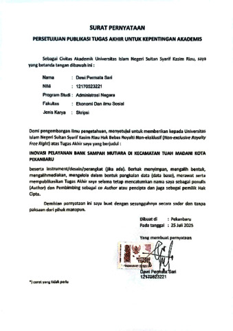 DEWI PERMATASARI, - (2025) INOVASI PELAYANAN BANK SAMPAH MUTIARA DI KECAMATAN TUAH MADANI KOTA PEKANBARU. Skripsi thesis, Universitas Islam Negeri Sultan Syarif Kasim Riau.