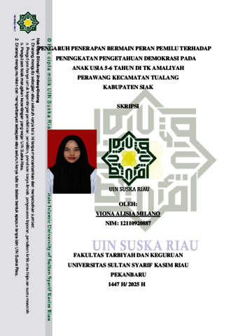 VIONA ALISIA MILANO (2025) PENGARUH PENERAPAN BERMAIN PERAN PEMILU TERHADAP PENINGKATAN PENGETAHUAN DEMOKRASI PADA ANAK USIA 5-6 TAHUN DI TK AMALIYAH PERAWANG KECAMATAN TUALANG KABUPATEN SIAK. Skripsi thesis, UNIVERSITAS ISLAM NEGERI SULTAN SYARIF KASIM RIAU.