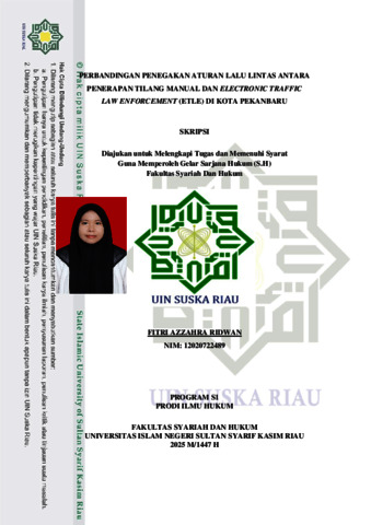 FITRI AZZAHRA RIDWAN, - (2025) PERBANDINGAN PENEGAKAN ATURAN LALU LINTAS ANTARA PENERAPAN TILANG MANUAL DAN ELECTRONIC TRAFFIC LAW ENFORCEMENT (ETLE) DI KOTA PEKANBARU. Skripsi thesis, UNIVERSITAS ISLAM NEGERI SULTAN SYARIF KASIM RIAU.