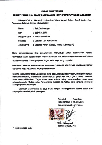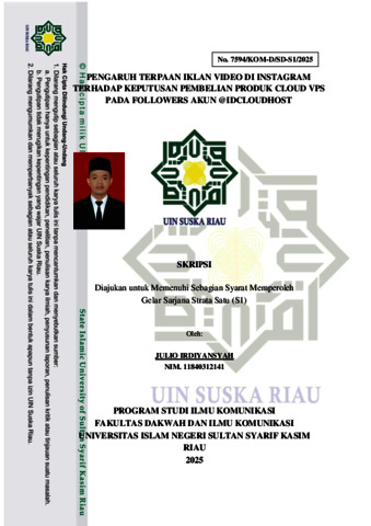 JULIO IRDIYANSYAH, - (2025) PENGARUH TERPAAN IKLAN VIDEO DI INSTAGRAM TERHADAP KEPUTUSAN PEMBELIAN PRODUK CLOUD VPS PADA FOLLOWERS AKUN @IDCLOUDHOST. Skripsi thesis, Universitas Islam Negeri Sultan Syarif Kasim Riau.