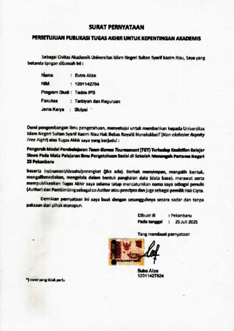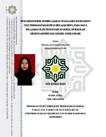 Sutra Aliza, - (2025) Pengaruh Model Pembelajaran Team Games Tournament Terhadap Keaktifan Belajar Siswa Pada Mata Pelajaran Ilmu Pengetahuan Sosial di Sekolah Menengah Pertama Negeri 23 Pekanbaru. Skripsi thesis, UIN SUSKA.