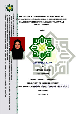 MIFTAHU RIZQOH, - (2025) THE INFLUENCE OF METACOGNITIVE STRATEGIES AND CRITICAL THINKING SKILLS ON READING COMPREHENSION OF GRADE EIGHT STUDENTS AT MADRASAH TSANAWIYAH NEGERI 6 KAMPAR. Thesis thesis, UNIVERSITAS ISLAM NEGERI SULTAN SYARIF KASIM RIAU.