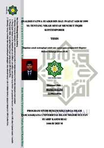 ABSTRAK Rizki Halim, (2025): Analisis Fatwa Syaikh Bin Baz (Wafat 1420 H/1999 M) tentang NikahMisyar Perspektif Fiqih Kontemporer Nikah Misyar merupakan bentuk pernikahan kontemporer yang dilakukan dengan kesepakatan bahwa istri melepaskan sebagian haknya seperti nafkah, tempat tinggal, dan giliran. Meskipun secara syarat dan rukun pernikahan terpenuhi, praktik ini menuai kontroversi dan perbedaan pendapat di kalangan ulama. Tesis ini bertujuan untuk menganalisis fatwa Syaikh Abdul Aziz bin Baz (w. 1420 H) tentang pelarangan nikah misyar dalam perspektif fikih kontemporer.Penelitian ini menggunakan metode kualitatif dengan pendekatan deskriptif-analitis. Data diperoleh dari kajian pustaka terhadap fatwa-fatwa Syaikh Bin Baz dan referensi fikih kontemporer lainnya. Syaikh Bin Baz memandang nikah misyar sebagai pernikahan yang tidak sah jika tidak disertai pengumuman (i‟lan). Ia menilai praktik ini menyerupai perzinaan karena dilakukan secara sembunyi-sembunyi dan merusak maqāṣid al-syarī‟ah, khususnya dalam menjaga kehormatan dan membangun keluarga yang harmonis.Fatwa beliau didasarkan pada pendekatan maqāṣidi yang mengutamakan tujuan syariat dan pertimbangan kemaslahatan. Berbeda dengan sebagian ulama kontemporer seperti Yusuf al-Qaradawi dan Muhammad Syuraim yang membolehkan nikah misyar selama syarat dan rukunnya terpenuhi serta istri rela melepaskan hak-haknya. Perbedaan ini mencerminkan dinamika pendekatan dalam fikih kontemporer, antara legal-formal dan maqashidi-substansial.Kesimpulannya, pandangan Syaikh Bin Baz merupakan bentuk kehati-hatian terhadap dampak sosial nikah misyar. Fatwanya menekankan pentingnya menjaga nilai moral, keadilan, dan perlindungan terhadap perempuan dalam institusi pernikahan di era modern. Kata Kunci: Nikah Misyar, Syaikh Bin Baz, Fatwa, Fikih Kontemporer,Maqashid al-Syari’ah