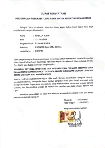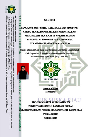 NABILLA JUNIR, - (2025) PENGARUH SOFT SKILL, HARD SKILL DAN MOTIVASI KERJA TERHADAP KESIAPAN KERJA DALAM MENGHADAPI ERA SOCIETY 5.0 PADA ALMUNI S1 FAKULTAS EKONOMI DAN ILMU SOSIAL UIN SUSKA RIAU ANGKATAN 2020. Skripsi thesis, UNIVERSITAS ISLAM NEGERI SULTAN SYARIF KASIM RIAU.