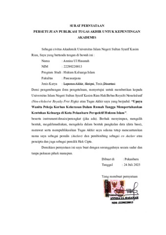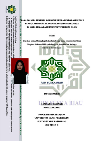 ANNISA UL HASANAH, - (2025) UPAYA WANITA PEKERJA KORBAN KEKERASAN DALAM RUMAH TANGGA MEMPERTAHANKAN KEUTUHAN KELUARGA DI KOTA PEKANBARU PERSPEKTIF HUKUM ISLAM. Thesis thesis, UNIVERSITAS ISLAM NEGERI SULTAN SYARIF KASIM RIAU.