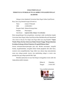 Kekerasan dalam rumah tangga merupakan salah satu permaslaahan sosial yang memiliki dampak luas, terutama bagi wanita pekerja di Kota Pekanbaru yang menjadi korbannya, akan tetapi mereka tetap bertahan dengan keluarganya. Fokus permasalahan dalam penelitian ini meliputi:bagaimana bentuk-bentuk KDRT wanita pekerja di Kota Pekanbaru, bagaimana upaya wanita pekerja korban KDRT di Kota Pekanbaru mempertahankan keutuhan keluarga di Kota Pekanbaru, bagaimana tinjauan hukum Islam terhadap upaya wanita pekerja mempertahankan keutuhan keluarga. Penelitian ini menggunakan jenis penelitian lapangan (field Research) dan penulis menggunakan metode dekstriptif kualitatif dalam mengelola dan menganalisis data, dalam penelitian ini data diperoleh dari data primer dan data sekunder, Teknik pengumpulan data yaitu Indepth Interview atau wawancara mendalam, dokumentasi, dan analisis dengan teknik deskriptif analtilik. Hasil penelitian ini menunjukkan bahwa (1) bentuk- bentuk KDRT wanita pekerja di Kota Pekanbaru terdiri dari kekerasan verbal dan psikolgis, kekerasan fisik dan emosional, kekerasan seksual dan ekonomi, kekerasan verbal dan sosial, kekerasan berbasis teknologi serta kekerasan pengendalian dan stigma hukum. (2) hasil penelitian dalam upaya wanita pekerja mempertahankan keutuhan keluarga di Kota Pekanbaru bahwa para wanita pekerja korban KDRT tetap berupaya menjalankan perannya dalam keluarga meskipun mengalami tekanan psikologis, sosial, dan ekonomi dengan cara mengandalkan pekerjaan sebagai ruang aman (3) adapun hasil dari tinjauan hukum terhadap upaya wanita pekerja mempertahankan keutuhan keluarga bahwa tindakan para wanita pekerja korban KDRT dinilai sebagai bentuk amanah dan pengabdian mulia selama tidak bertentangan dengan syariat. Islam menegaskan larangan terhadap KDRT dan mengedepankan keadilan serta perlindungan terhadap perempuan. Kata Kunci: wanita pekerja, KDRT, keutuhan keluarga