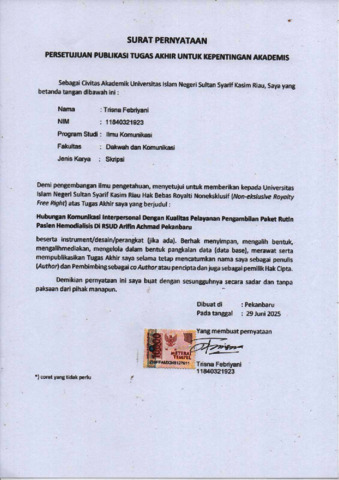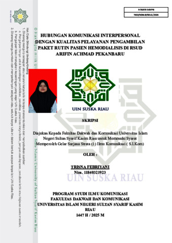 Trisna Febriyani, - (2025) Hubungan Komunikasi Interpersonal Dengan Kualitas Pelayanan Pengambilan Paket Rutin Pasien Hemodialisis Di RSUD Arifin Achmad Pekanbaru. Skripsi thesis, UNIVERSITAS ISLAM NEGERI SULTAN SYARIF KASIM RIAU.