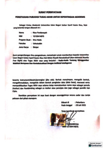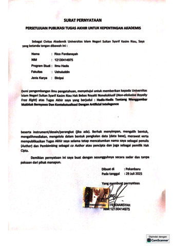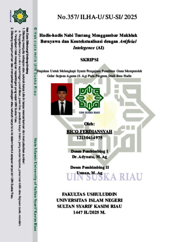 Skripsi saya yang berjudul Kontekstualisasi Hadis Larangan Menggambar Makhluk Bernyawa Menggunakan Artificial Intelegence (AI). Perkembangan teknologi Artificial Intelligence (AI) telah menghadirkan berbagai inovasi dalam bidang seni, termasuk dalam menggambar makhluk bernyawa. Hal ini memunculkan persoalan baru dalam wacana keislaman, khususnya terkait dengan hadis-hadis yang melarang menggambar makhluk bernyawa. Penelitian ini bertujuan untuk mengkaji status dan pemahaman terhadap hadis-hadis tersebut serta menganalisis perspektif hadis dalam konteks penggunaan teknologi AI. Penelitian ini menggunakan metode kualitatif dengan pendekatan studi kepustakaan (library research), di mana data diperoleh dari literatur primer seperti kitab-kitab hadis dan syarah, serta literatur sekunder berupa buku, artikel ilmiah, dan jurnal yang relevan. Hasil penelitian menunjukkan bahwa larangan dalam hadis ditujukan kepada aktivitas tashwir yang bermakna menyerupakan ciptaan Allah secara utuh, terutama ketika berpotensi disembah. Namun, dalam konteks AI, peran manusia tidak langsung dalam menciptakan gambar menimbulkan perbedaan interpretasi di kalangan ulama kontemporer. Penelitian ini menekankan pentingnya kontekstualisasi hadis agar tetap relevan dengan perkembangan teknologi modern, sekaligus menjaga prinsipprinsip ajaran Islam. Hasil kajian ini diharapkan dapat memberikan kontribusi dalam pengembangan kajian hadis di era digital dan menjadi pertimbangan etis bagi pengguna teknologi AI dalam seni visual. Kata Kunci: kontekstualisasi, hadis , artificial intelligence (AI )