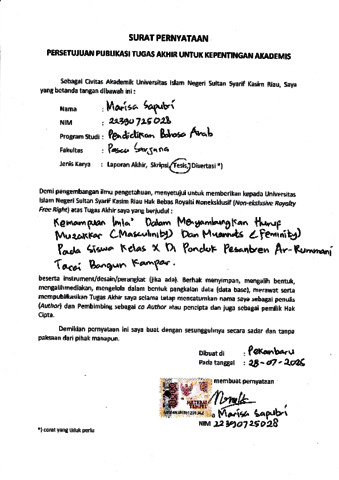 Kemampuan Imla’ Dalam Menyambungkan Huruf Muzakkar (Maskulinity) Dan Muannats (Feminity) Pada Siswa Kelas X Di Pondok Pesantren Ar- Rummani Tarai Bangun Kampar Penelitian ini bertujuan untuk mengetahui kemampuan siswa kelas X MA Anshor Al-Sunnah dalam menulis huruf Arab melalui kegiatan imla’, khususnya dalam aspek penyambungan huruf, baik huruf yang dapat disambung (mudzakkar) maupun huruf yang tidak dapat disambung (muannats). Metode yang digunakan adalah deskriptif kualitatif dengan dua teknik utama pengumpulan data, yaitu tes tulis dan wawancara kelompok. Hasil tes menunjukkan bahwa kemampuan tertinggi siswa terdapat pada penulisan huruf muannats dengan persentase 68,33%, sementara kemampuan dalam menulis huruf muzakkar lebih rendah, yaitu 59,54%. Hasil ini menunjukkan bahwa siswa lebih mampu dalam menulis huruf-huruf yang tidak dapat disambung, sementara mereka masih membutuhkan lebih banyak latihan dalam menulis huruf-huruf yang dapat disambung. Sementara itu, hasil wawancara menunjukkan bahwa sebagian besar siswa mengalami kesulitan dalam mengenali bentuk huruf Arab saat berada di awal, tengah, dan akhir kata. Beberapa siswa juga menyebutkan bahwa suara guru cukup jelas, tetapi kecepatan dalam menjelaskan kadang menyulitkan dalam memahami bentuk huruf dengan tepat. Selain itu, faktor lain yang turut memengaruhi kemampuan mereka adalah kurangnya latihan menulis, terbatasnya metode pembelajaran, serta minimnya koreksi langsung dari guru saat terjadi kesalahan. Secara keseluruhan, hasil penelitian menunjukkan bahwa kemampuan siswa dalam menulis huruf Arab melalui imla’ sudah cukup baik, namun tetap membutuhkan pendekatan pembelajaran yang lebih variatif dan fokus untuk meningkatkan keterampilan secara menyeluruh. Kata Kunci: Kemampuan Imla’, Huruf Mudzakkar, Huruf Muannats, Penulisan Arab, Siswa Kelas X, MA Rummani
