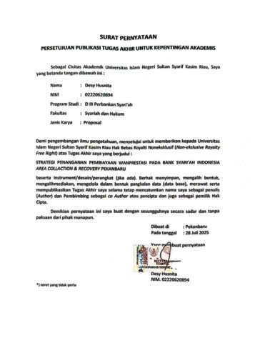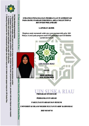 DESY HUSNITA, - (2025) STRATEGI PENANGANAN PEMBIAYAAN WANPRESTASI PADA BANK SYARIAH INDONESIA AREA COLLECTION & RECOVERY PEKANBARU. Skripsi thesis, Universitas Islam Negeri Sultan Syarif Kasim Riau.