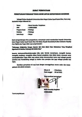 HUBUNGAN RELIGIUSITAS DENGAN QUARTER LIFE CRISIS (QLC) PADA MAHASISWA YANG MENGIKUTI ORGANISASI DI FAKULTAS PSIKOLOGI UIN SUSKA RIAU