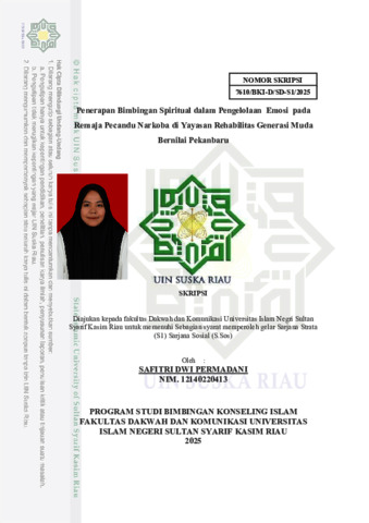 SAFITRI DWI PERMADANI, - (2025) Penerapan Bimbingan Spiritual dalam Pengelolaan Emosi pada Remaja Pecandu Narkoba di Yayasan Rehabilitas Generasi Muda Bernilai Pekanbaru. Skripsi thesis, UNIVERSITAS ISLAM NEGERI SULTAN SYARIF KASIM RIAU.