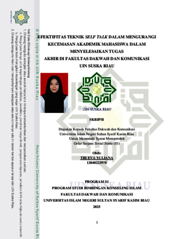 TRI EVA YULIANA, - (2025) EFEKTIFITAS TEKNIK SELF TALK DALAM MENGURANGI KECEMASAN AKADEMIK MAHASISWA DALAM MENYELESAIKAN TUGAS AKHIR DI FAKULTAS DAKWAH DAN KOMUNIKASI UIN SUSKA RIAU. Skripsi thesis, UNIVERSITAS ISLAM NEGERI SULTAN SYARIF KASIM RIAU.