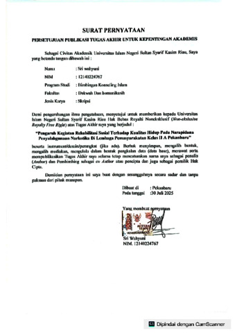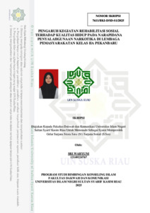 SRI WAHYUNI, - (2025) PENGARUH KEGIATAN REHABILITASI SOSIAL TERHADAP KUALITAS HIDUP PADA NARAPIDANA PENYALAHGUNAAN NARKOTIKA DI LEMBAGA PEMASYARAKATAN KELAS IIA PEKANBARU. Skripsi thesis, UNIVERSITAS ISLAM NEGERI SULTAN SYARIF KASIM RIAU.