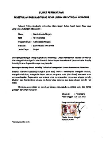 GLADIS KURNIA NINGSIH, - (2025) PENERAPAN KONSEP SMART MOBILITY TERHADAP TRANSPORTASI UMUM TRANS METRO PEKANBARU. Skripsi thesis, Universitas Islam Negeri Sultan Syarif Kasim Riau.