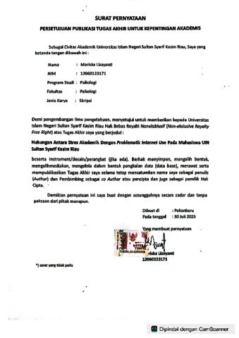 MARISKA LIZAYANTI, - (2025) HUBUNGAN ANTARA STRES AKADEMIK DENGAN PROBLEMATIC INTERNET USE PADA MAHASISWA UIN SULTAN SYARIF KASIM RIAU. Skripsi thesis, Universitas Islam Negeri Sultan Syarif Kasim Riau.